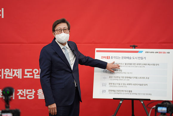 이어 일상 속 문화가 살아 있는 도시는 구별 문화의 거리 조성 및 메세나 협회 설립 지원, 문화예술분야 종사자들이 활동하기 좋은 도시는 부산창작자 타운 조성 및 복지금고 설립이라고 설명했다.