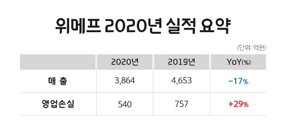 위메프는 지난해 연간 실적을 잠정 집계한 결과, 영업손실 540억원을 기록했다고 3일 밝혔다. 이는 지난해 757억원 대비 29% 개선된 수치다. 매출액은 전년대비 17% 줄어든 3864억원이다.