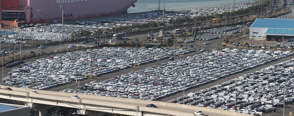 현대차 울산공장 수출선적부두와 야적장에 완성차들이 대기하고 있는 모습. ⓒ 연합뉴스