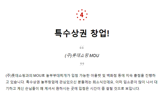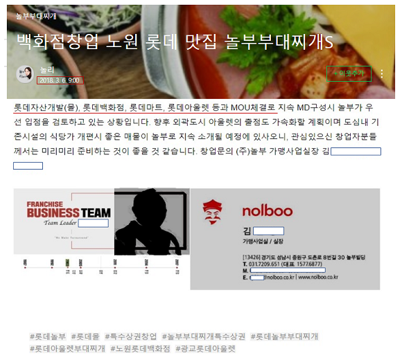 회사가 직접 운영하는 놀부의 공식 블로그에서도 이 같은 주장은 반복됐다. 특수상권의 장점을 설명하는 가운데 "롯데자산개발(몰), 롯데백화점, 롯데마트, 롯데아울렛 등과 MOU체결로 지속 MD구성시 놀부가 우선 입점을 검토하고 있는 상황"이라는 구체적 표현도 확인됐다.