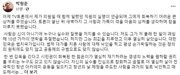 이어 "지금 사회에 기여하고 있는 사람을 거론하며 십수년 전의 일로 공개적으로 모욕하는 행동은 리더로서의 자질 이전에 우리 공동체의 구성원으로서의 기본적인 도덕감정에도 맞지 않는 일"이라며 "다른 사람의 명예를 공개적으로 훼손할 권리는 누구도 갖고 있지 않다"고 덧붙였다.