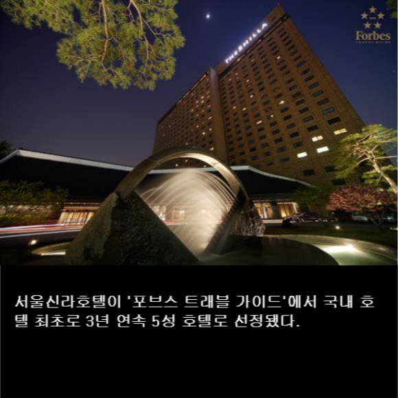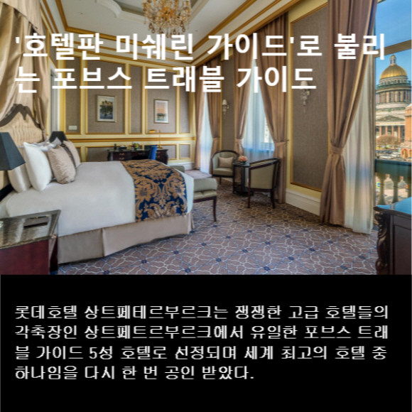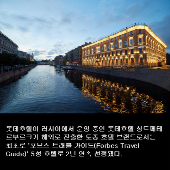 [프라임경제] 롯데호텔이 러시아에서 운영 중인 롯데호텔 상트페테르부르크가 해외로 진출한 토종 호텔 브랜드로서는 최초로 '포브스 트래블 가이드(Forbes Travel Guide)' 5성 호텔로 2년 연속 선정됐다. 또한, 서울신라호텔은 '포브스 트래블 가이드'에서 국내 호텔 최초로 3년 연속 5성 호텔로 선정됐다.