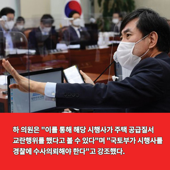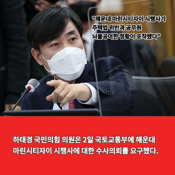 [프라임경제] 하태경 국민의힘 의원은 2일 해운대 마린시티자이 시행사의 주택법 위반 의혹에 관해 "국토교통부가 시행사를 경찰에 수사의뢰해야 한다"고 요청했다.