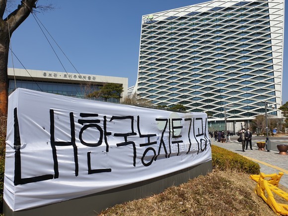 전국농민회 부산경남연맹이 LH 진주본사에 한국농지투기공사 현수막을 부착했다. ⓒ 강경우 기자
