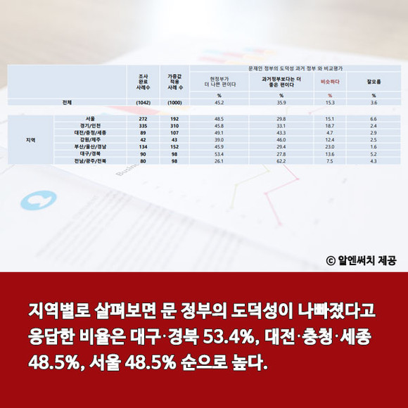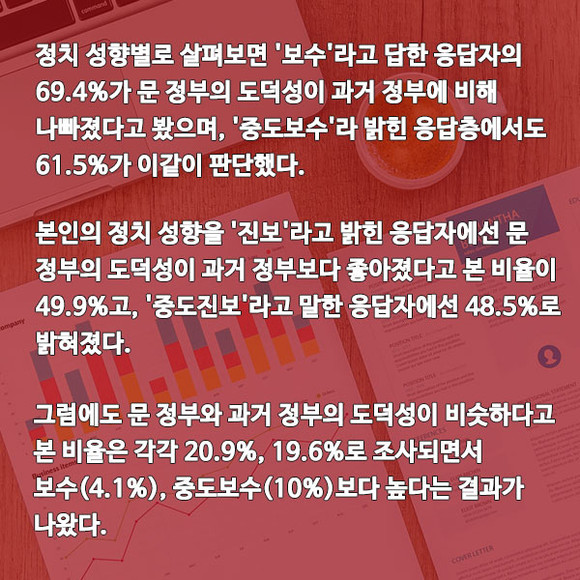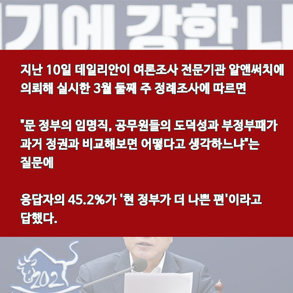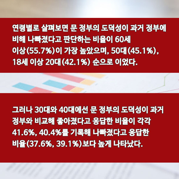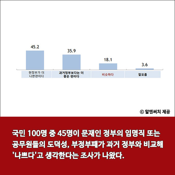 [프라임경제] 국민 100명 중 45명이 문재인 정부의 임명직 또는 공무원들의 도덕성, 부정부패가 과거 정부와 비교해 '나쁘다'고 생각한다는 여론조사 결과가 나왔다.
