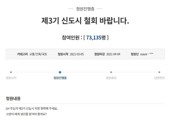 아울러 청와대 국민청원 게시판에 올라온 '제3기 신도시 철회 바랍니다' 청원글에 12일 10시 기준 7만3000여명이 동참하고 있다.
