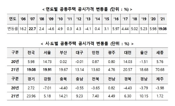 국토교통부가 15일 공개한 '2021년도 공동주택 공시가격안'에 따르면, 아파트 공시가격이 전년대비 19.08% 급증했다. Ⓒ 프라임경제