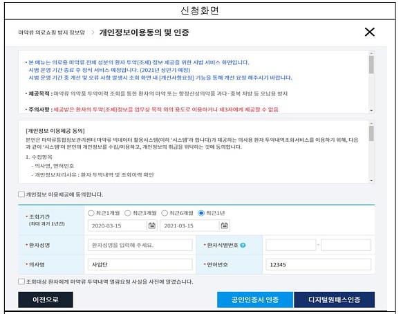 마약류 의료쇼핑 방지 정보망 신청 및 조회화면. © 식약처