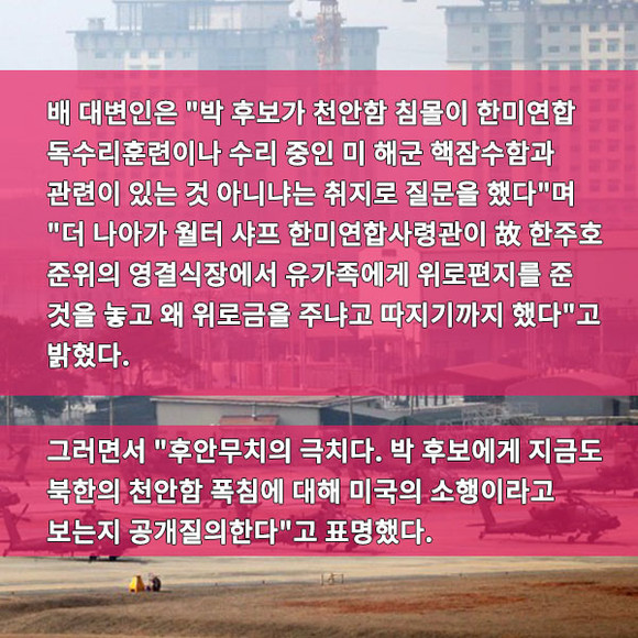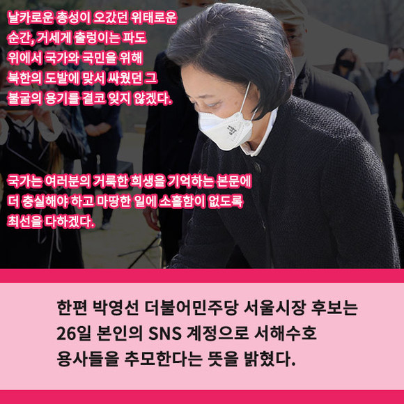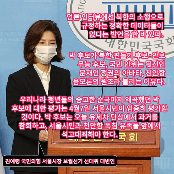 [프라임경제] 서해수호의 날인 26일, 국민의힘은 박영선 더불어민주당 서울시장 후보가 천안함침몰진상규명특위 위원으로 지냈던 당시에 했던 발언들을 언급하면서 사죄를 촉구했다.
