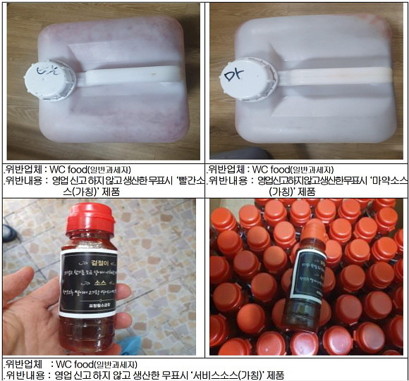 조사결과, 즉석판매제조·가공업 영업신고를 하지 않은 A업체(경북 포항시 소재)가 2019년 10월부터 제조일자, 유통기한 등 식품정보를 표시하지 않고 '곱창소스' 등 5종을 불법으로 제조해 전국 가맹점 12곳에 3479kg(판매액 1798만원 상당)을 판매한 것으로 조사됐다.