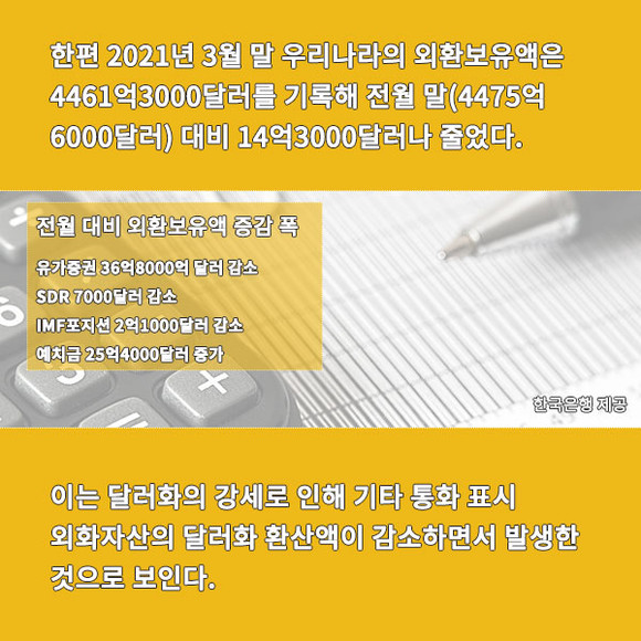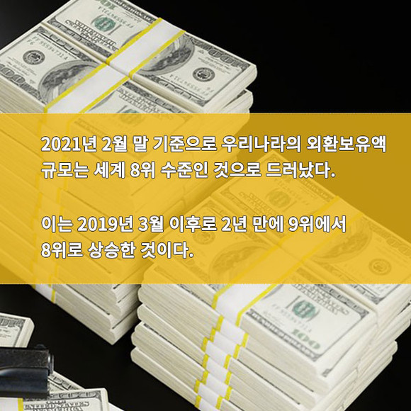 [프라임경제] 2019년 3월 이후로 2021년 2월 말 우리나라의 외환보유액 규모는 세계 9위에서 8위로 상승했다.