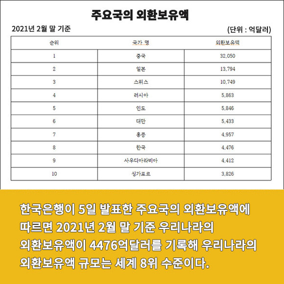 [카드뉴스] 우리나라 외환보유액, 2년 만에 세계 8위