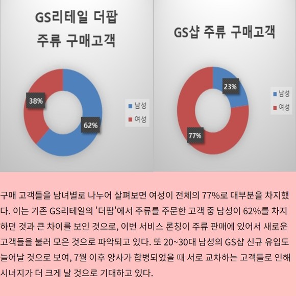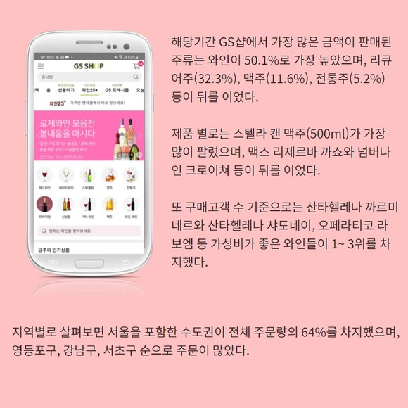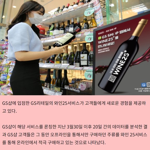GS샵이 해당 서비스를 론칭한 지난 3월30일 이후 20일 간의 데이터를 분석한 결과 GS샵 고객들은 그 동안 오프라인을 통해서만 구매하던 주류를 와인 25서비스를 통해 온라인에서 적극 구매하고 있는 것으로 나타났다.