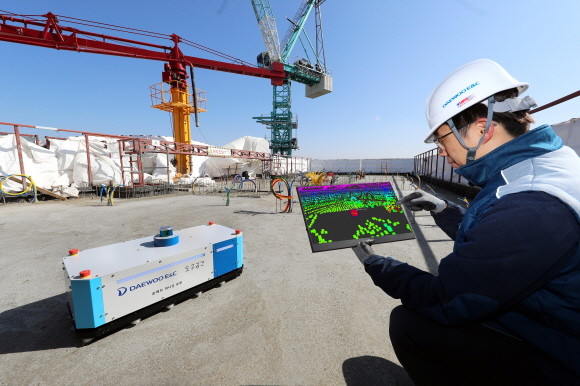 나아가 현장 콘크리트 타설 후 마감 작업 자동 수행하는 '자율주행기반 콘크리트 슬래브(slab) 피니싱 로봇'도 개발, 지난 2월 수지 스카이뷰 푸르지오 현장에 시험 적용했다.