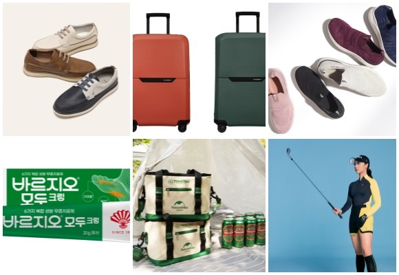 (왼쪽부터 시계방향) 소다 데일리 밴딩 보트슈즈, 쌤소나이트 매그넘 에코, 레드페이스 퓨즈 니트 슬립온, PGA TOUR & LPGA 골프웨어 스윙밸런스 티셔츠, 칭따오X네이처하이크 쿨러백 패키지, 동화약품 바르지오® 모두 크림. © 각 사