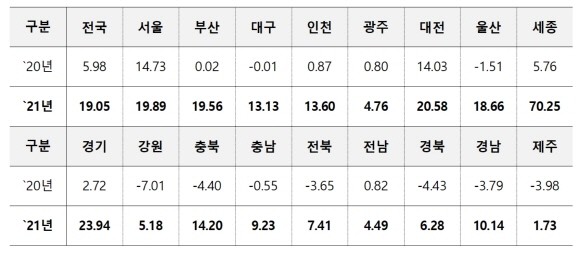 시도별로는 세종 변동률이 전국에서 가장 높은 70.25%를 기록했으며, 그 뒤를 이어 △경기 23.94% △대전 20.58% △서울 19.89% △부산 19.56% △울산 18.66% 순이다.