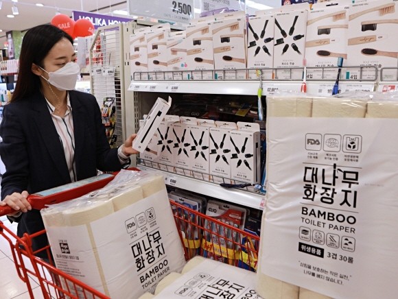 롯데마트가 무라벨 시리즈에 이어 29일부터 전 점에서 우수 중소기업과 협업해 대나무 소재로 만든 칫솔과 화장지를 선보인다. © 롯데마트
