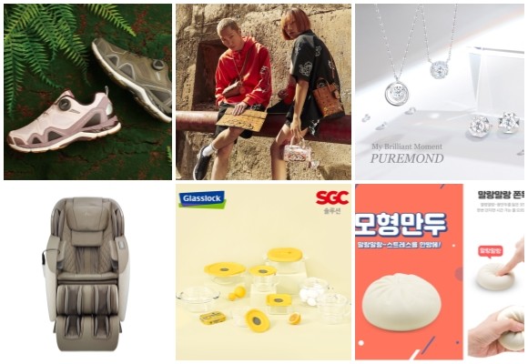 (왼쪽부터 시계방향) 레드페이스 PFS 워킹화, MCM x 샘바이펜 리미티드 에디션 컬렉션, 오에스티 퓨어몬드 컬렉션, 못된고양이 모형 만두, SGC솔루션 글라스락 렌지쿡 미라클 에디션, SK매직 소파형 고급 안마의자. © 각 사