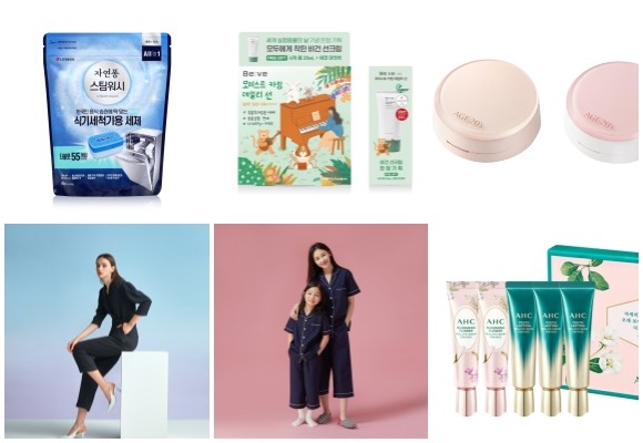 (왼쪽부터 시계방향) LG생활건강 자연퐁 스팀워시 식기세척기용 세제, 비브 크루얼티프리 키트, 애경산업 글래스 에센스 팩트, AHC 시인 나태주 에디션, 자주 파자마세트, 소다 크리스탈 스트랩 슬링백. © 각 사