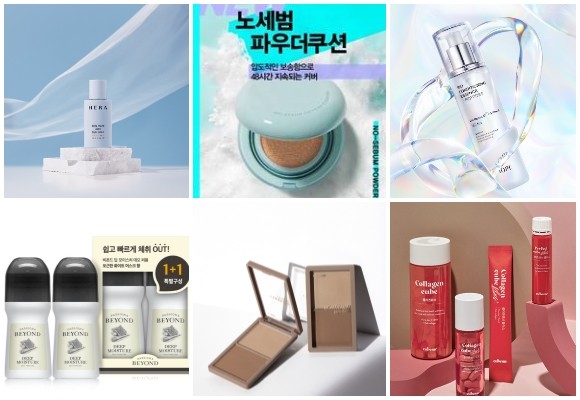 (왼쪽부터 시계방향) 아모레퍼시픽 에어리 선 밀크, 이니스프리 노세범 파우더 쿠션, 아이오페 바이오 컨디셔닝 에센스 쓰리 펩타이드, 큐브미 콜라겐큐브 퍼스트·콜라겐큐브 플러스, 에뛰드 그림자쉐딩 브러쉬, 비욘드 딥 모이스처 데오 퍼퓸. © 각 사