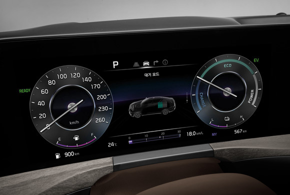 기아는 K8 하이브리드에 △하이브리드 전용 17인치 전면가공 휠 △후면부 하이브리드 엠블럼 △하이브리드 특화 클러스터 그래픽을 추가해 하이브리드의 개성을 더했다.