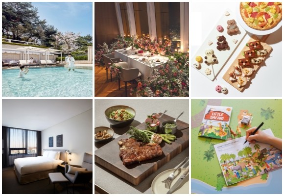 (왼쪽부터 시계방향) 서울신라호텔 어번 패밀리 패키지, 시그니엘 서울 롱 앤 래스팅 러브, 롯데호텔 서울 겟 휘겔리 프로모션, 라한호텔 가족의 달 프로모션, 해비치 호텔앤드리조트 뉴욕 티본 스테이크 프로모션, 글래드호텔 마포 티 산책 패키지. © 각 사