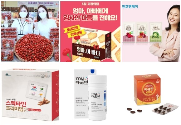 (왼쪽부터 시계방향) 롯데마트 캘리포니아산 체리·엄마 아빠다 기획팩, 천호엔케어 건강즙 3종, 동아제약 써큐란 코큐텐·써큐란 알티지오메가-3 1200, 마이코드 엠에스엠, 현대약품 스펙타민 프리미엄. © 각 사