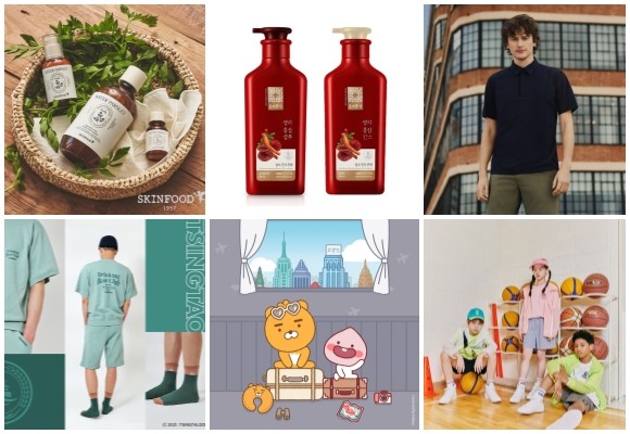 (왼쪽부터 시계방향) 스킨푸드 판토테닉 워터 파슬리 라인, 동의홍삼 영지 홍삼, 유니클로 X 띠어리 컬렉션, 한세엠케이 NBA키즈 캐릭터 라인, 쌤소나이트 레드 X 리틀 카카오프렌즈 컬렉션, 칭따오X하이버 콜라보 컬렉션. © 각 사