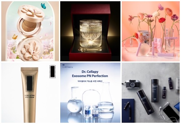 (왼쪽부터 시계방향) 오휘 얼티밋 커버 리프팅 쿠션 플라워 에디션·더 퍼스트 다이아데인 크림, 마몽드 빈티지 플라워 에디션, 아이오페 남성 안티에이징 신제품 2종, 닥터셀라피 엑소좀 피엔 퍼펙션, 엔터니티 텐 에스이씨 리프팅 스팟 크림. © 각 사