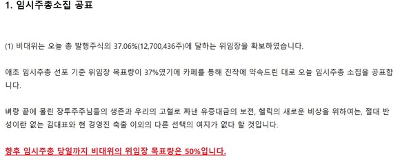 비대위 측은 "애초 임시주총 선포 기준 위임장 목표량이 37%였기에 임시주총 소집을 공표한다"고 밝혔다.