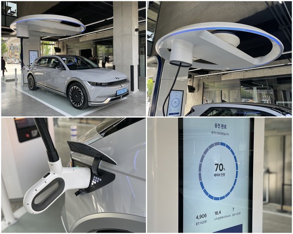 아이오닉 5를 충전하는 모습과 배터리 잔량을 확인할 수 있는 사진들. = 노병우 기자