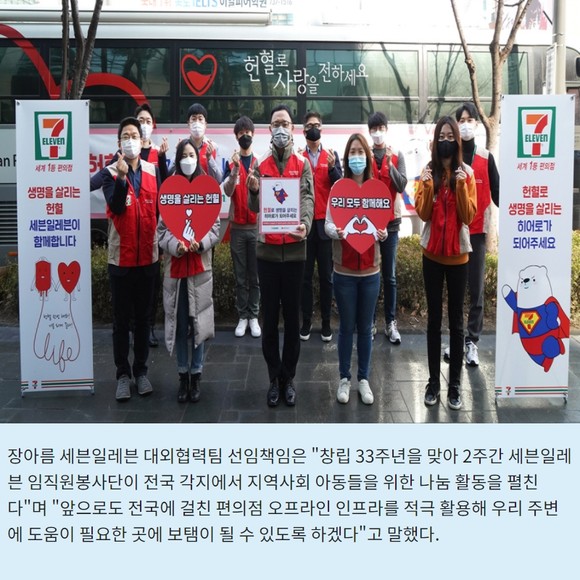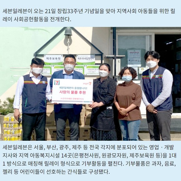 [프라임경제] 세븐일레븐이 오는 21일 창립33주년 기념일을 맞아 지역사회 아동들을 위한 릴레이 사회공헌활동을 전개한다.