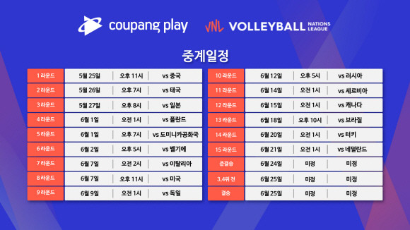이로써 한국 대표팀은 최소 15개 경기 풀리그를 치르고, 4위 이내의 성적을 달성하면 4강 토너먼트에 진출한다. 6월24일에 준결승, 25일에 결승전이 예정돼 있다. 쿠팡플레이는 대한민국이 출전하는 모든 경기를 중계함으로써 국내 배구팬들이 편리하게 경기를 시청할 수 있도록 지원한다.