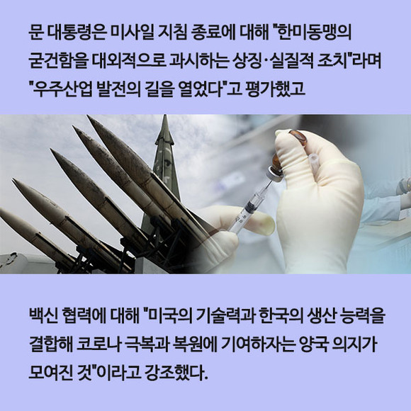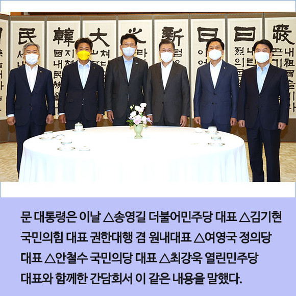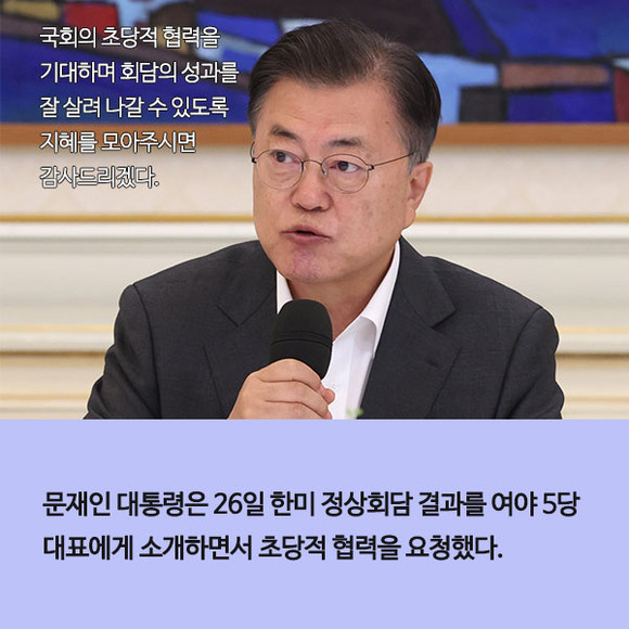 [프라임경제] 문재인 대통령은 26일 미사일 지침 종료 및 백신 협력 등의 한미 정상회담 결과을 언급하면서 여야 5당 대표에게 협력을 요청했다.