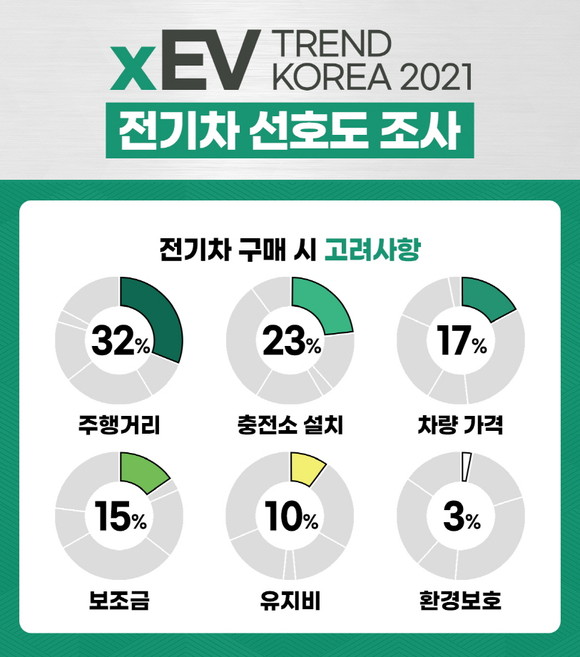다음으로 차량 가격(22→17%), 국가보조금(19→15%) 순으로 나타났는데, 지난 설문에 비해 전기차 차량가격과 보조금에 대한 고민이 줄어든 것으로 나타났다. 전기차 성능 향상에 따른 전체적인 가격인상과 국가보조금이 점차 축소되고 있는 상황을 소비자들이 인지하고 있는 것으로 분석된다.