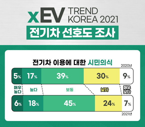 2021년 전기차 선호도 결과에 따르면 전기차 구매 희망시기를 묻는 질문에 5년 이내에 구입하겠다는 응답자가 87%에 달하며, 전년 대비 23%나 높게 나타났다. 가장 높은 구매의사를 보인 시기는 2~3년(42%, 601명)이었고 △3~5년(20%, 294명) △내년(16%, 224명) △올해(9%, 125명) 순으로 뒤를 이었다.