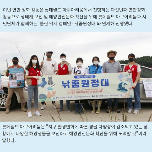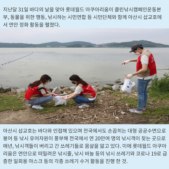 [프라임경제] 지난달 31일 바다의 날을 맞아 롯데월드 아쿠아리움이 클린낚시캠페인운동본부, 동물을 위한 행동, 낚시하는 시민연합 등 시민단체와 함께 아산시 삽교호에서 연안 정화 활동을 펼쳤다.