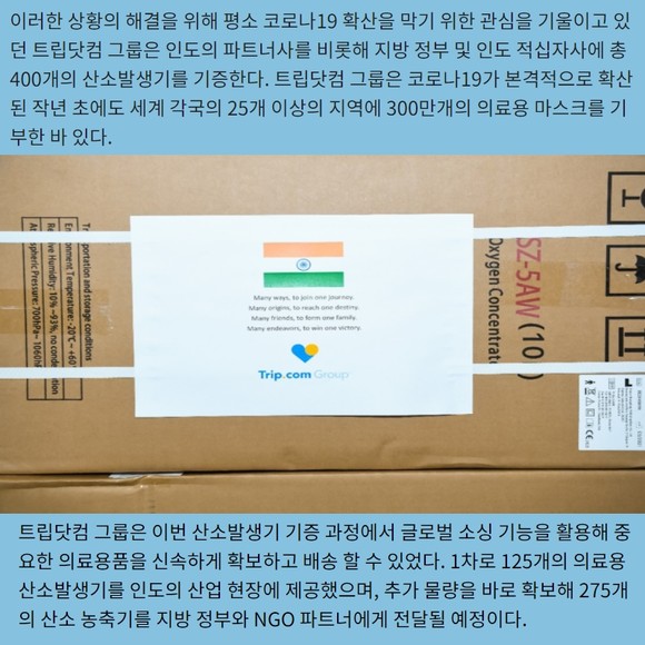 [프라임경제] 트립닷컴 그룹이 인도가 코로나19 위기 동안 산소장비 부족 문제를 해결할 수 있도록 지원하기 위한 의료구호계획을 시작했다.