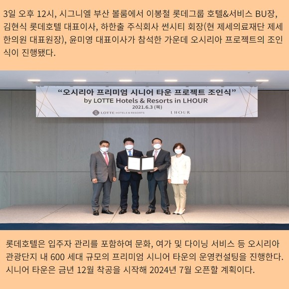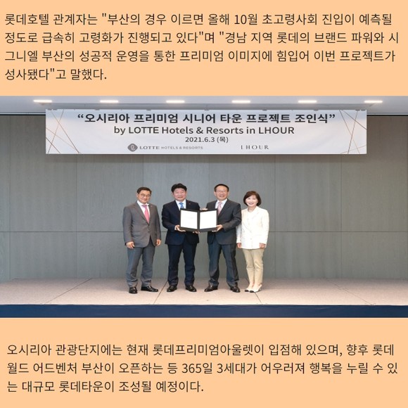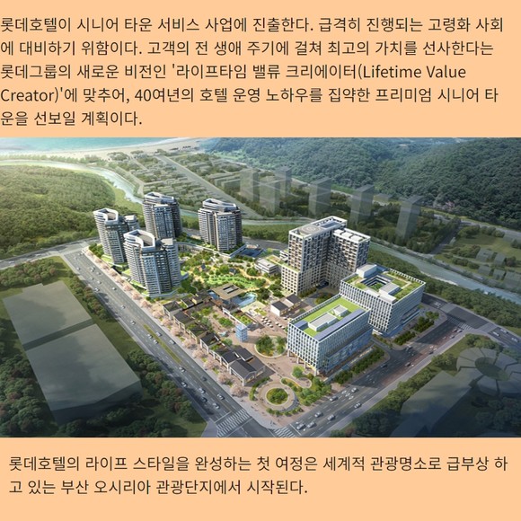 [프라임경제] 롯데호텔이 시니어 타운 서비스 사업에 진출한다. 급격히 진행되는 고령화 사회에 대비하기 위함이다. 고객의 전 생애 주기에 걸쳐 최고의 가치를 선사한다는 롯데그룹의 새로운 비전인 '라이프타임 밸류 크리에이터(Lifetime Value Creator)'에 맞춰, 40여년의 호텔 운영 노하우를 집약한 프리미엄 시니어 타운을 선보일 계획이다.