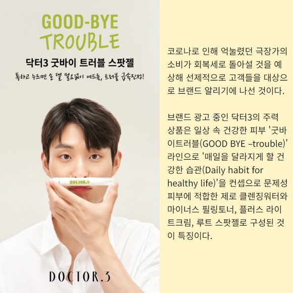 이번 광고는 극장을 찾은 고객들이 가장 먼저 접하게 되는 매표소, 티켓판매대 등과 극장 내 배치된 디지털 형태의 동영상 매체들을 통해 극장을 찾은 고객들이 닥터3 브랜드를 접할 수 있도록 했다.