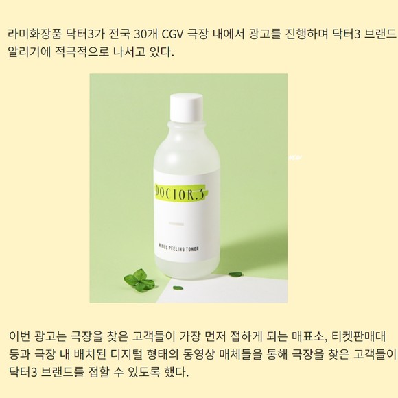 [프라임경제] 라미화장품 닥터3가 전국 30개 CGV 극장 내에서 광고를 진행하며 닥터3 브랜드 알리기에 적극적으로 나서고 있다.
