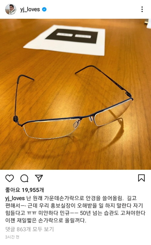 8일 정 부회장은 SNS에 "난 원래 가운데 손가락으로 안경을 쓸어 올린다. 길고 편해서"라며 "그런데 우리 홍보실장이 오해 받을 일 하지 말란다. 자기 힘들다고"라고 언급했다.