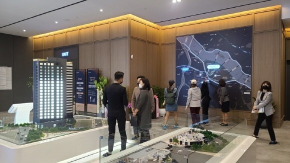 반도건설 '여의도 리미티오148' 견본주택을 방문한 관람객들이 모형도를 살펴보고 있다. © 반도건설