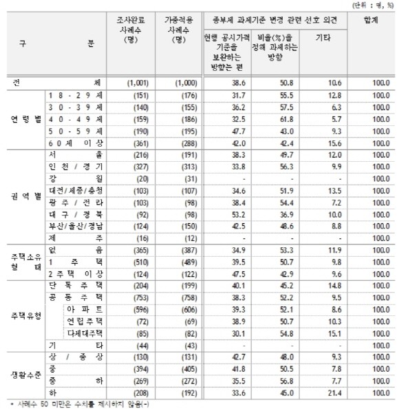 '비율(%) 과세'와 현행 공시가격 보완' 가운데 선호안을 확인한 결과 현행 보완(38.6%)보단 비율 과세(50.8%)를 보다 선호하는 것으로 확인됐다.