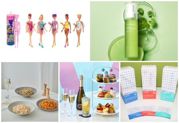 (왼쪽부터 시계방향) 손오공 바캉스 컬러리빌 바비, 센텔리안 마데카 수딩 미스트, JW홀딩스 마이코드 모먼트 팩 3종, 워커힐 아시아나항공 마일리지 이용 여름 패키지 3종 프로모션, 글래드 호텔앤리조트 글래드 잇츠앳홈 브랜드로 볶음밥 3종. © 각 사