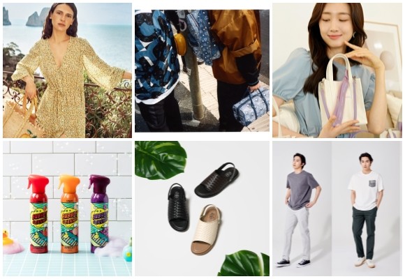 (왼쪽부터 시계방향) 바네사브루노 캡슐 컬렉션, MCM 빈티지 모노그램 자카드 캡슐 컬렉션, 슈펜X밤비걸' 2차 협업 상품, 버커루 쿨맥스 팬츠, 소다 위빙 투웨이 샌들, 아이오감 버블클렌저 3종. © 각 사
