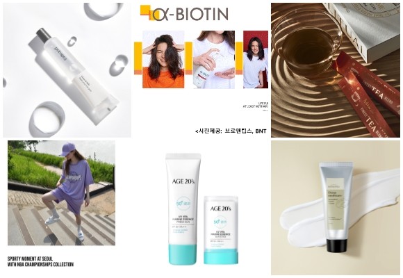 (왼쪽부터 시계방향) 프리메라 클린 앤 세이프 새니타이저 겔, 브로앤팁스 BNT 알파비오틴 탈모증상 완화 샴푸 3종, 홀리추얼 미라클 타임, LG생활건강 딥 모이스처 스무딩 페이셜 크림, 에이지트웨니스 UV 베일 마린 에센스 선, NBA 챔피언십 라인. © 각 사