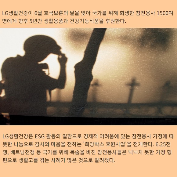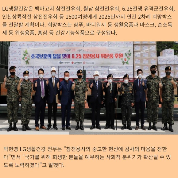 롯데면세점은 본격 여름이 시작되기 전 폭염에 취약한 폐지수집 어르신 및 농업 이주 노동자를 위해 임직원들과 함께 마련한 기부금을 재단법인 아름다운가게에 전달했고 LG생활건강은 6월 호국보훈의 달을 맞아 국가를 위해 희생한 참전용사 1500여명에게 향후 5년간 생활용품과 건강기능식품을 후원한다.
