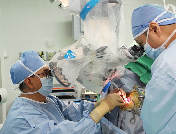 박봉진 경희대병원 신경외과 교수(좌측)가 미세혈관감압술을 진행하고 있다. © 경희의료원