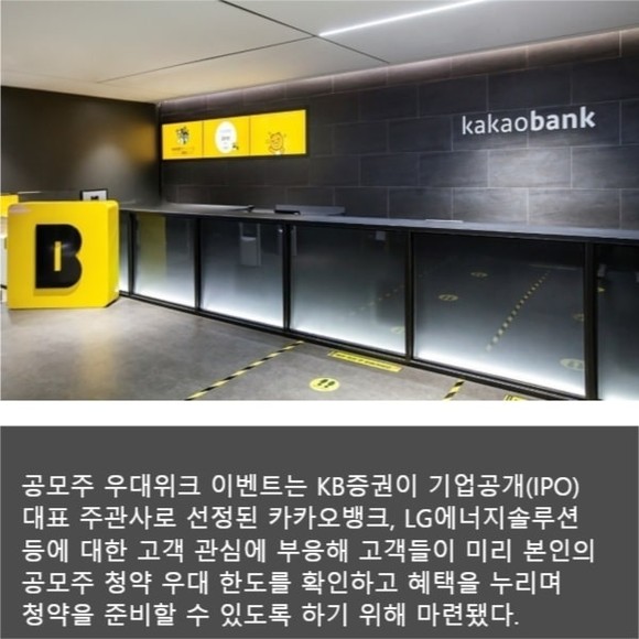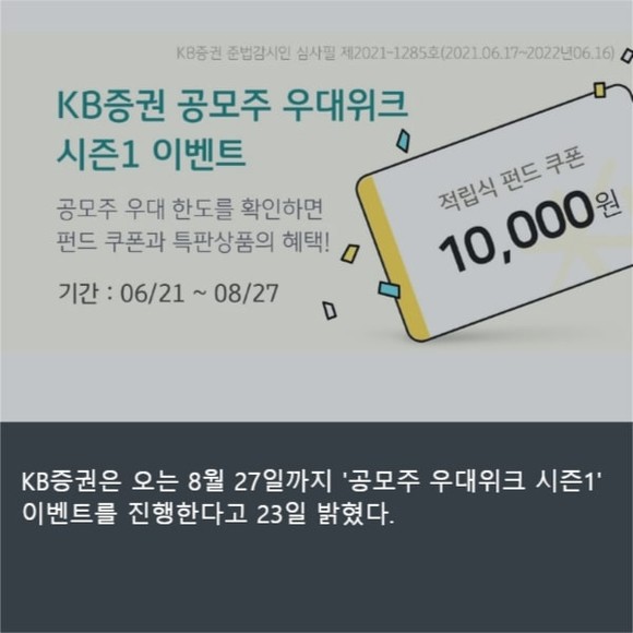 [프라임경제] KB증권은 오는 8월 27일까지 '공모주 우대위크 시즌1' 이벤트를 진행한다고 23일 밝혔다.